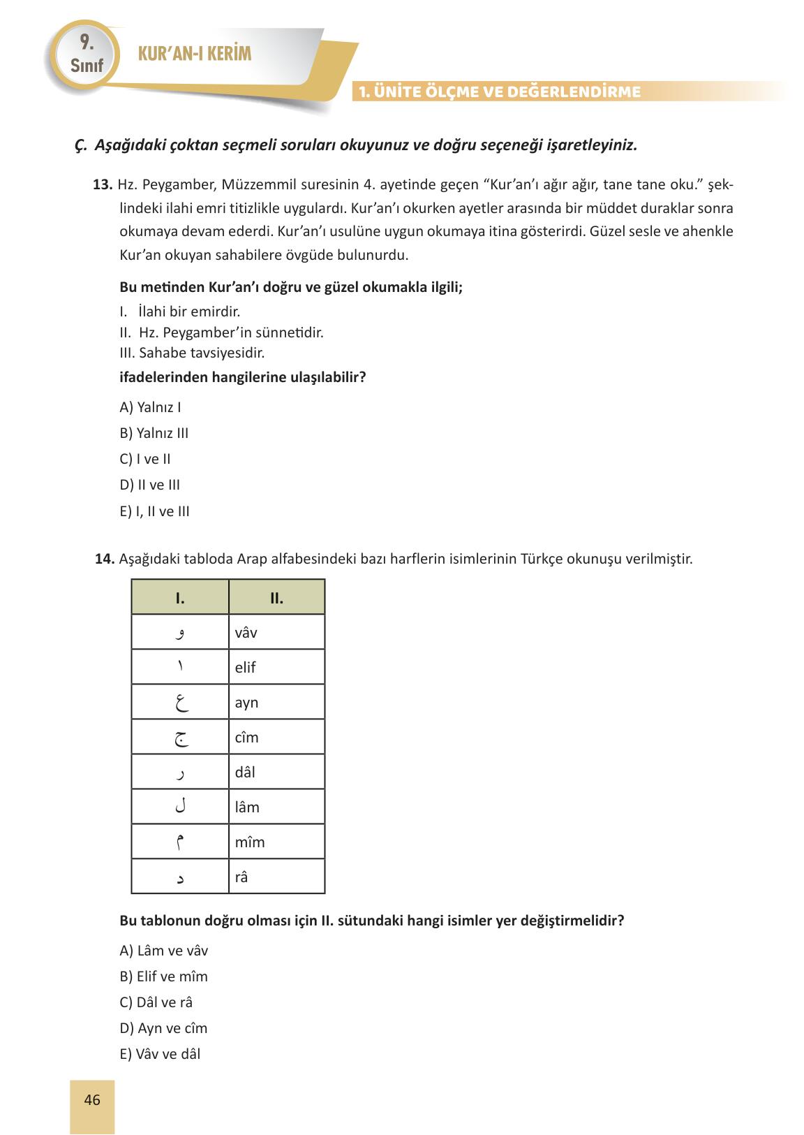 9.sınıf kuran-ı kerim ders kitabı meb yayınları sayfa 46 cevap anahtarı cevabı sayfa olarak çözümlerini yanıtları sizler için sunduk. Tüm ders kitabı cevapları gelecek yıl yine sitemizde olacak.