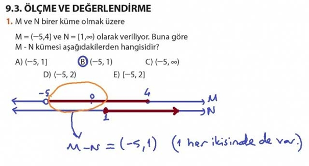 1. M ve N birer küme olmak üzere M = (-5,4] ve N = [1,∞) olarak veriliyor. Buna göre