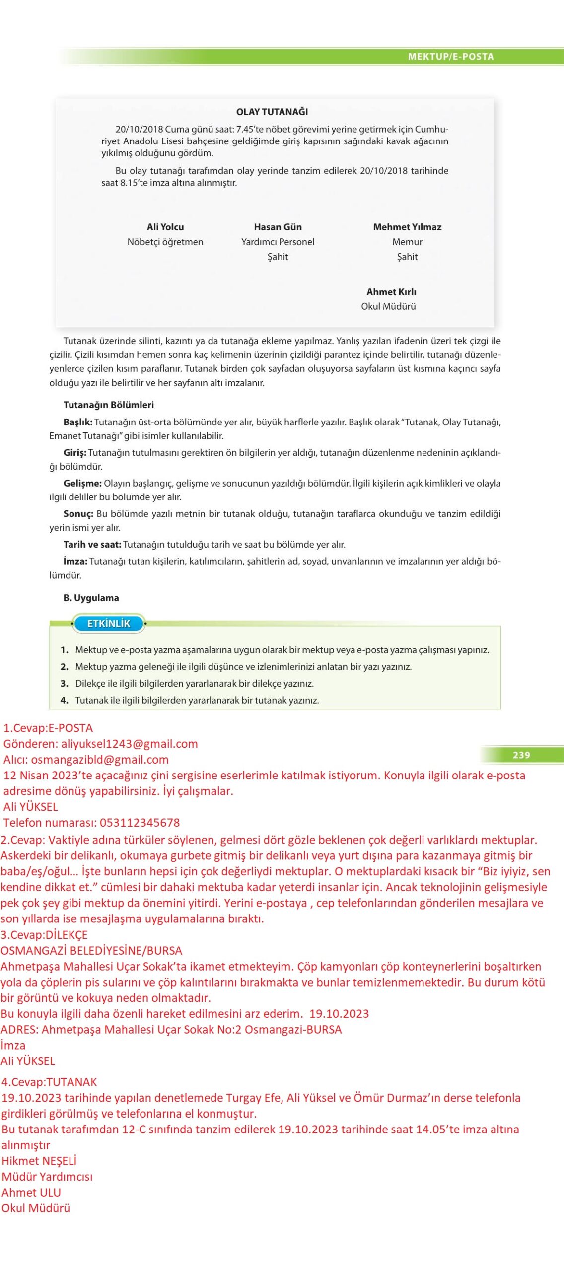 9.sınıf türk dili ve edebiyatı ders kitabı ödev yayınları sayfa 239 cevap anahtarı cevabı sayfa olarak çözümlerini yanıtları sizler için sunduk. Tüm ders kitabı cevapları gelecek yıl yine sitemizde olacak.