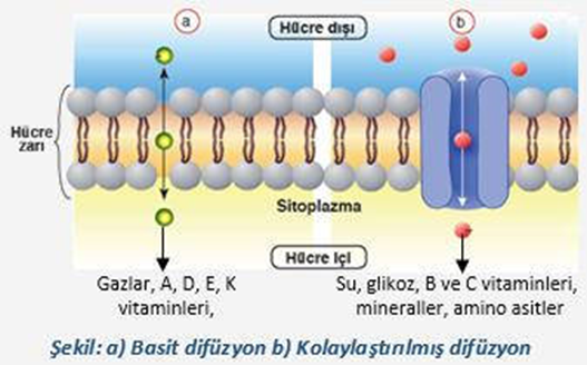 B. Kolaylaştırılmış Difüzyon: Su ve suda çözünen bazı maddeler, hücre zarındaki fosfolipit tabakadan genelde geçemez ancak protein yapılı özel taşıyıcılar üzerinden veya proteinlerin oluşturduğu kanallardan geçebilir. Moleküllerin bu şekilde zardan geçişine kolaylaştırılmış difüzyon denir.