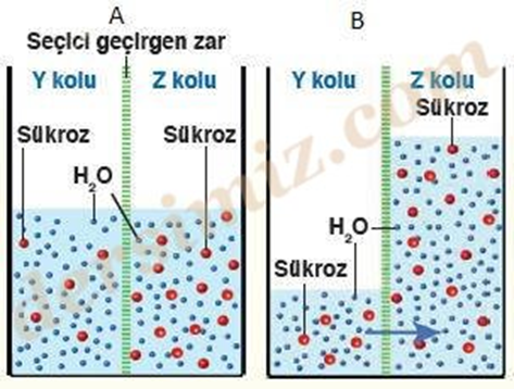 Yukarıdaki düzenekte suyun osmozla seçici geçirgen zardan geçişi gösterilmiştir. Başlangıçta Z kolundaki sükroz yoğunluğu yüksek, Y kolundaki sükroz yoğunluğu düşüktür. Sükroz, seçici geçirgen zardan geçemeyecek kadar büyüktür; daha küçük olan su molekülleri çok bulunduğu Y kolundan daha az bulunduğu Z koluna doğru geçer.